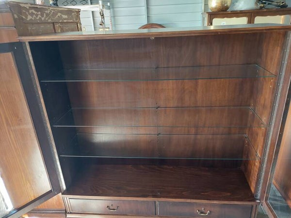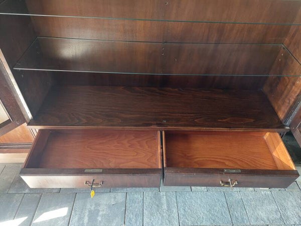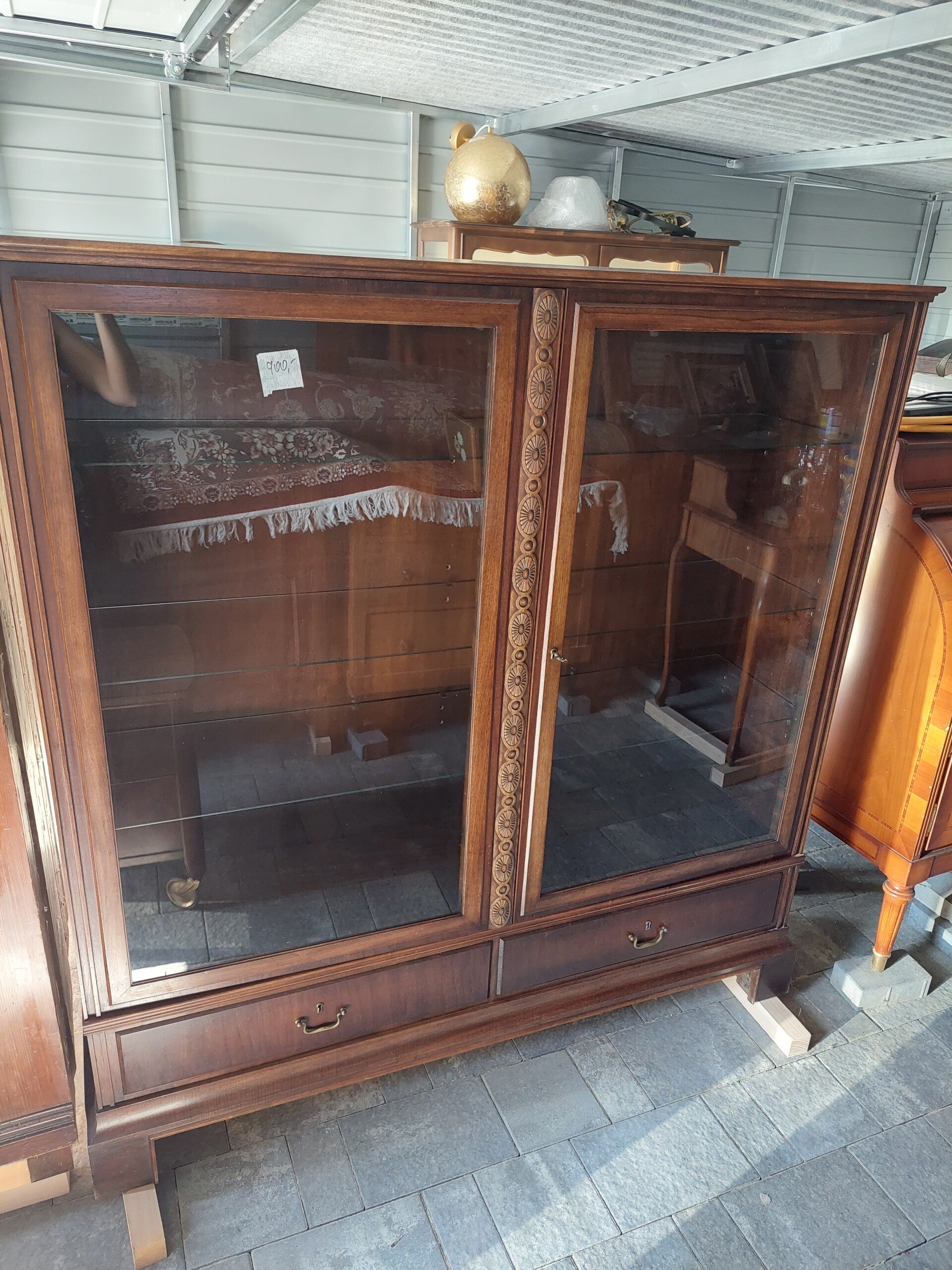 Stara witryna zamykana na klucz. W bardzo dobrym stanie. Jedyny mankament to małe uszczerbienie szklanej półki.